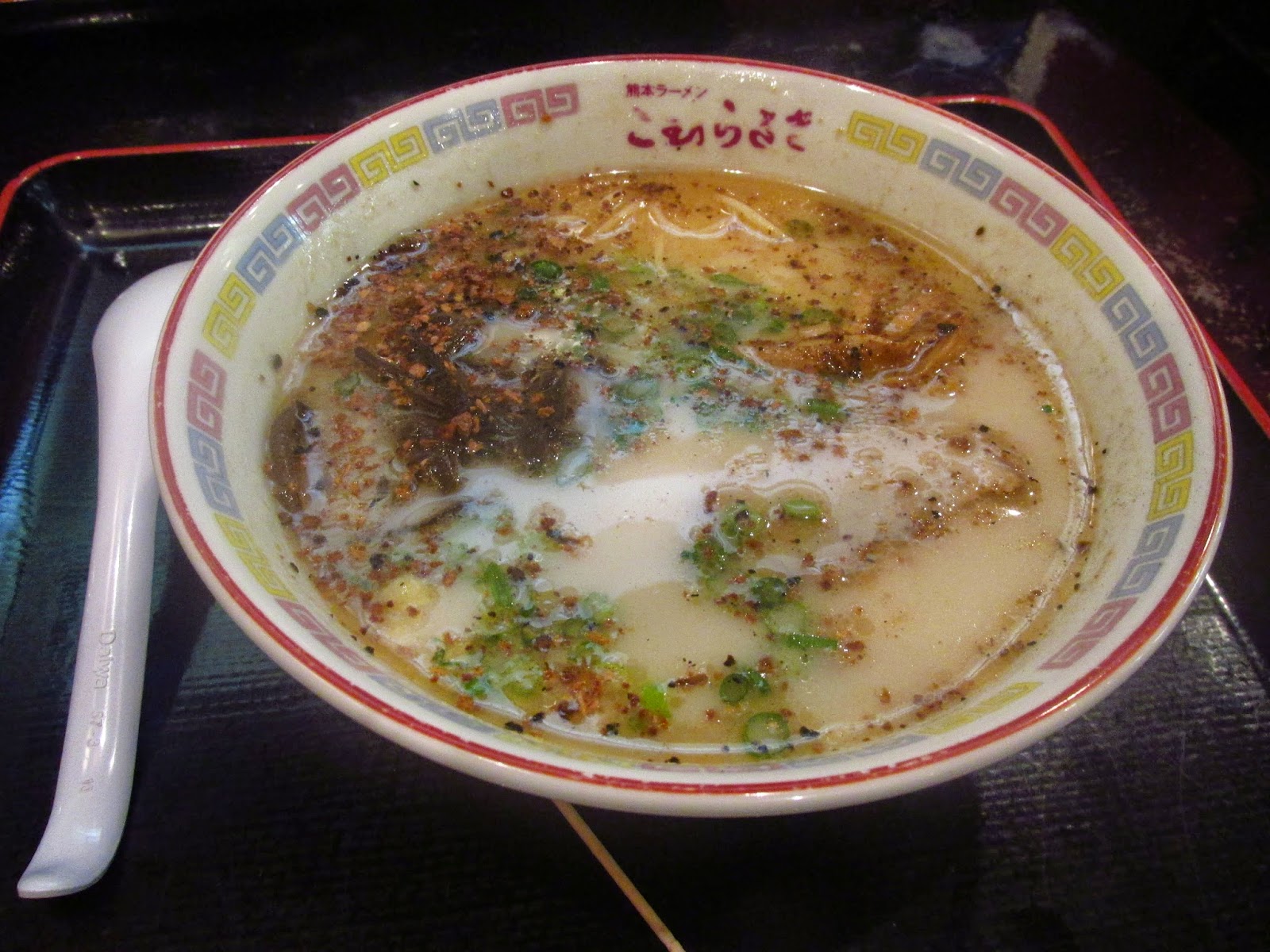 Our last stop was Komurasaki, a shop originally from the western prefecture of Kumamoto, which specialized in pork bone soup. Contrary to the nearby and very-famous hakata ramen, which also uses a pork bone based soup, the soup at Komurasaki was rather light, though both types of ramen use thin noodles. Komurasaki's special flourish was the roasted garlic chips, which gave the dish a really nice smell.